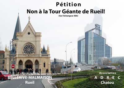 Une association de Rueil prend contact avec l’ADREC pour l’informer du projet de construction d’une tour géante sur l’échangeur routier entre le pont de Chatou et l’autoroute A86. Cette association, « Bellerive-Malmaison », s’élève contre ce projet, très invasif dans le paysage des bords de Seine, et propose à l’ADREC de partager sa cause.