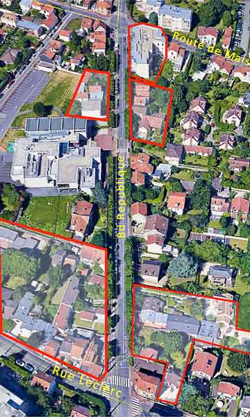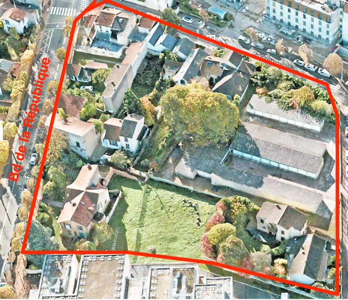 Vue aérienne du futur chantier de 143 logements bd de la République.Le terrain à batir, propriété de la mairie, comporte 37 arbres, 36 seront abattus. L'Adrec a demandé la sauvegarde d'un magnifique tilleul. Peine perdue. En tant que propriétaire du terrain la municipalité pouvait imposer la sauvegarde de certains sujets. Le promoteur, Nexity, prévoit de planter quelques arbres...Nous avons découvert que certains seront plantés sur une dalle de béton..